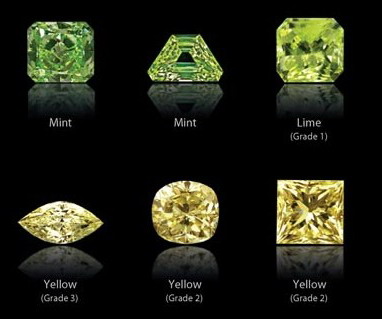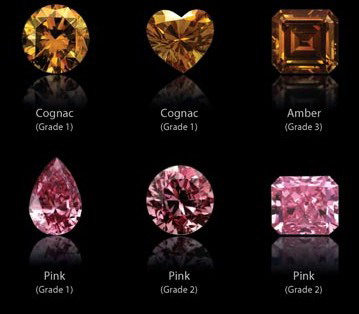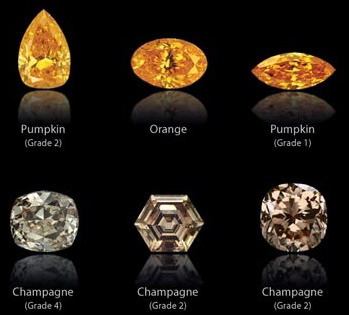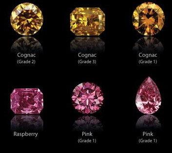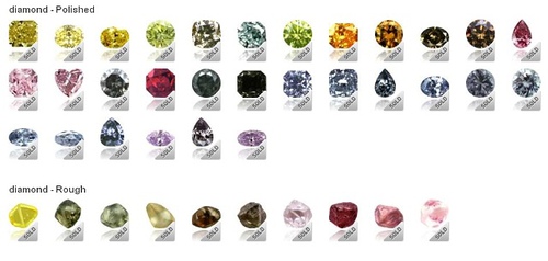 有颜色的钻石,又称为彩钻,主要成因是无色钻石内的微粒起变化而产生的颜色,不同的变化产生不同的颜色,因此颜色越罕有,价值亦愈高。 彩钻的颜色,较常见的有金黄色、棕色、绿色,其它如粉红、红色、蓝色就较为罕有,往往可遇而不可求,如蓝色 的霍普钻石,堪称稀世珍宝,价值当然也不菲。 高品质的粉红钻也被视为稀世奇珍,澳大利亚是全球粉红钻惟一的固定来源。高品质的粉红钻一般于每年10月进行公开竟卖,而品质较普通的则依一般途径销售。 棕色钻石利用其不同深浅的色调,表现对比的美感,若利用金黄色彩钻与白钻组合,制做的首饰也非常漂亮,且独具魅力。 彩钻在悄然无息中已占据了一定市场,因为消费者在观念外的颜色有了更多选择,但应注意的是,现在有人将天然钻石经放射处理制为彩钻,颜色虽然较浓,但看起不是很滑透,有点油闷;不够亮丽,其闪耀性也差,无法与天然品相比。若分辨其优劣,则较着重色调,色调愈纯,愈浓,就愈珍贵。