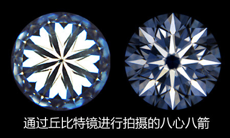 在英文中,我们用H&A(Heart Arrow)来代表大家熟知的八心八箭.或许人们对八心八箭的成因感到好奇(为什么会形成八心八箭?)主要是两个车工条件: 1.钻石有极好的对称性。 2.圆形钻石的车工其冠角和亭角达到一定的匹配。 H&A是一种圆钻(另外还有一种圆方钻)中出现的光学现象,57面的标准圆多面型钻石(就是大家所熟知的圆钻)用切工镜观看时,如果台面向上可见从中心呈放射型的八箭图案,亭部向上时可观察到八颗心的图案,心的尖部朝中心,这就是八心八箭现象。所以,所谓的八心八箭不是一种特殊切工,只是普通圆钻的切工等级达到一定标准所呈现出的图案效果。一般的圆多面型钻石只要拥有不错的对称性,就有可能看到类似八心和八箭的图案。